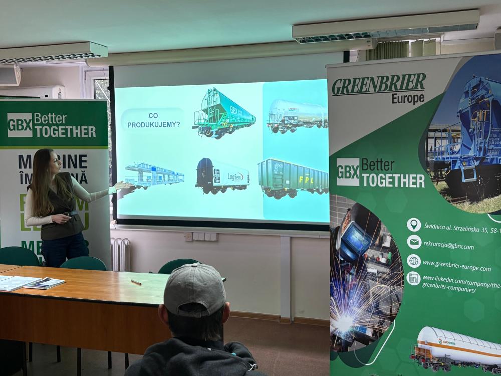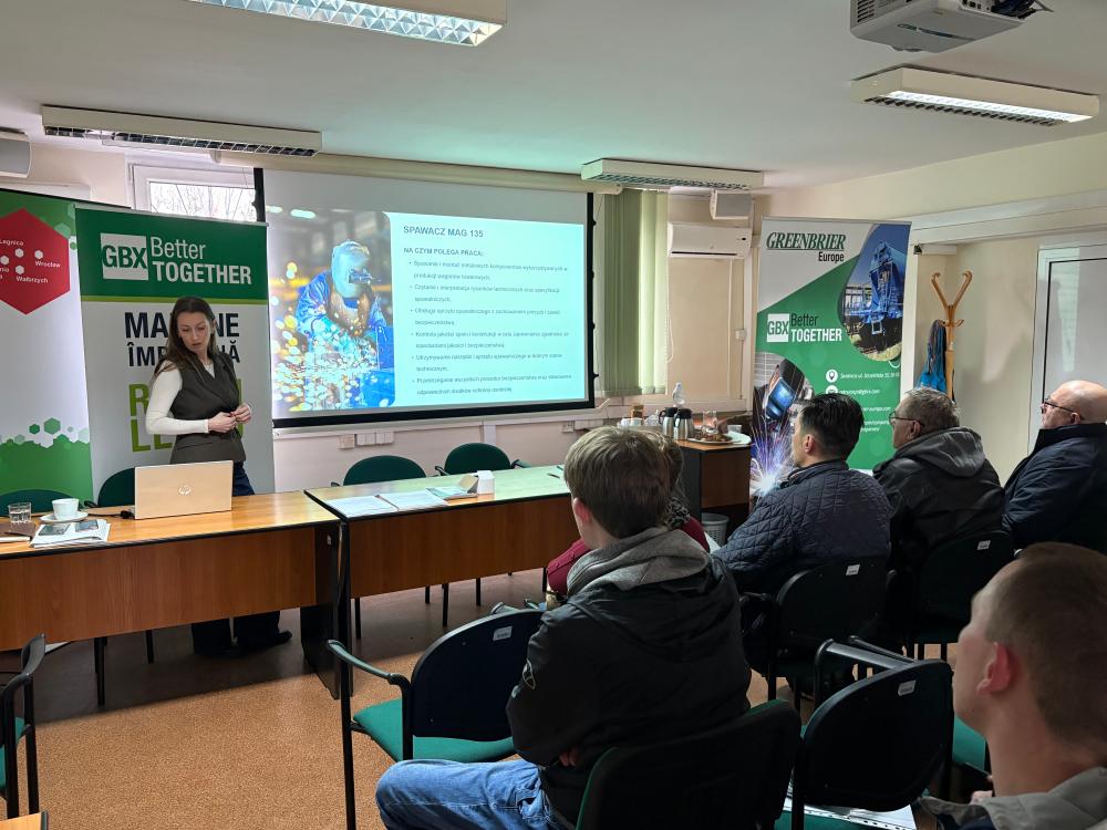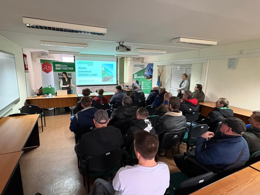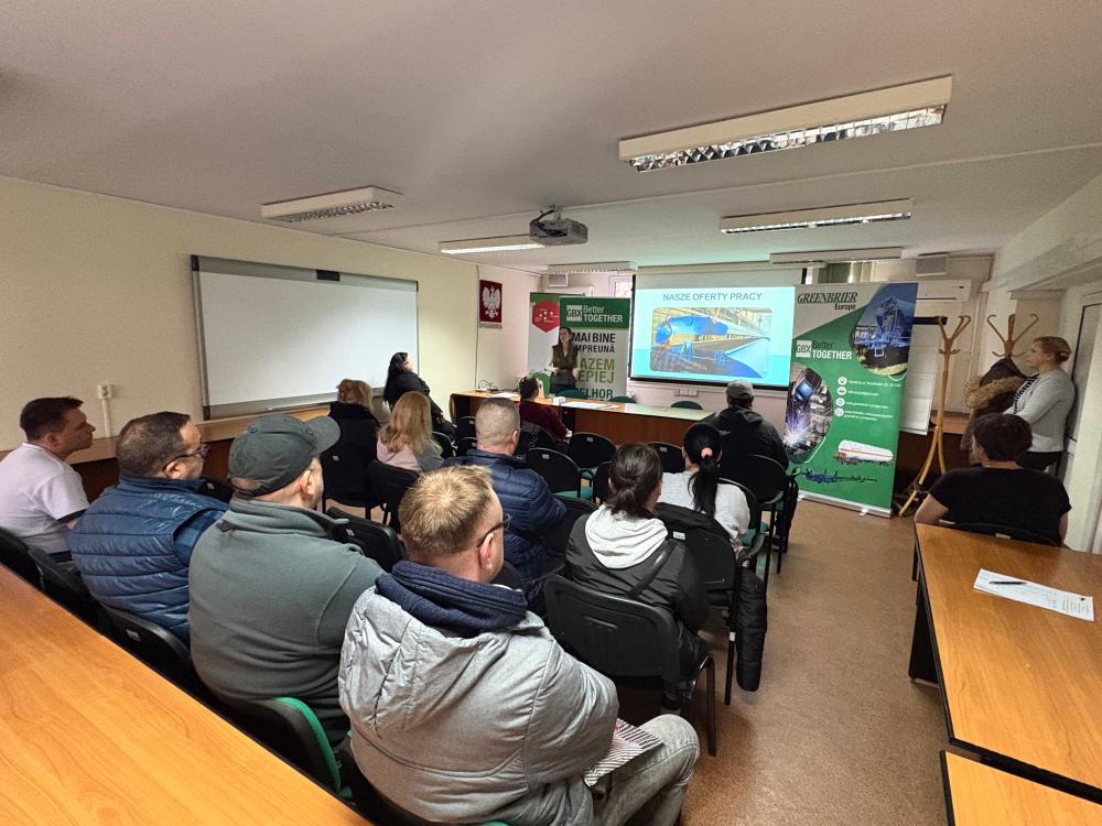 Spotkanie prowadzone było przez przedstawicielkę firmy GreenBrier Europe, która szczegółowo omówiła wymagania, warunki pracy oraz możliwości rozwoju zawodowego w firmie.